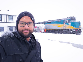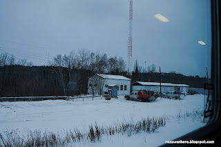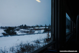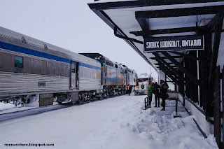 Soon it was sunrise but nothing changed in the way of landscape views. Everything in sight was covered in snow. At around 1130 am we stopped at Sioux Lookout. Again the smokers heaved a sigh of relief when the conductor mentioned about the stop. It was around minus 15 degrees outside (in Celsius).I wandered around a bit here. The day was dark and cold. Many passengers got down and strolled around the station. The smokers had by now formed a group and were smoking together. The locomotive staff got busy in refueling. As for me I just wandered around aimlessly looking at the locomotives for some time and then walking along the length of the train in the snow. All around me was white snow. Everywhere! Soon it was time to go.