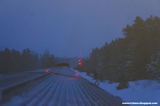 As it was winter sunrise was around 8 am. At 4 in the morning it was still night. I knew it was too early but my excitement made any more sleep impossible. As I walked to the rear of my carriage into the next one I could see people trying out various ways to make their sleep on the seats as comfortable as possible. Some were using bags as props, some curled up on base of the seats, some just slept as rigid as a statue. I entered the deserted dome car and grabbed a seat. The night views from the dome cars were surreal. Everything was pitch black which was only broken whenever we passed by some town. The lights of far away sparkled in the black of the night. On places where lights were shining they illuminated the surfaces covered with snow. Of all the things I loved looking at solitary streetlamps. They were like a beacon in the night. A small space of light around darkness.