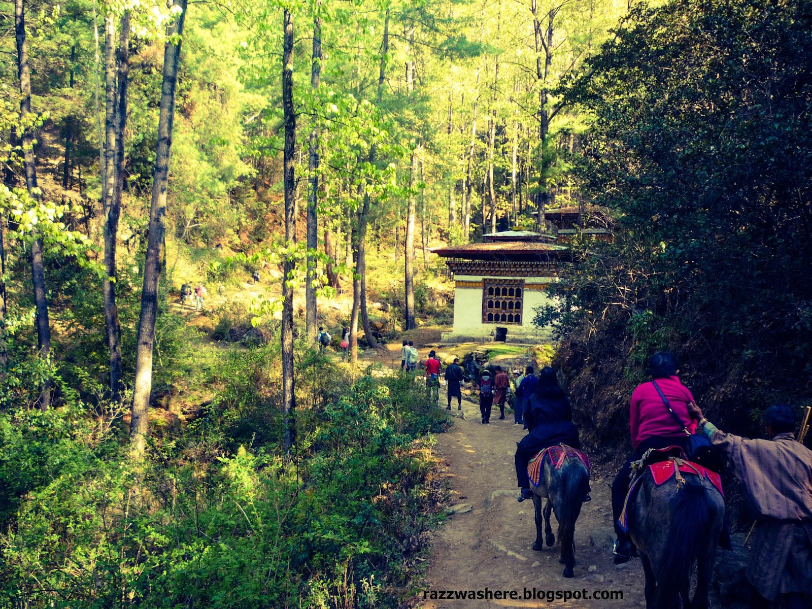 Having got off from the bus I looked around at the surroundings.We were standing at the foot of the series of hills,on one of which stood that spectacular monastery but we couldn’t see it yet as we were surrounded by trees all around. Immediately before us lay the path as it started out from the middle of a row of souvenir shops. There were a lot of tourists already present and still more were arriving in vehicles most of them being coasters and imported cars.Looking at this rate of incoming tourists and keeping in mind the climb of 3 hours before us, our Bhutanese guide,Sangayji nudged us to start walking on the trail. We did so and soon fell into the rhythmic walk that comes with treks.The area was covered with trees and bushes.Here and there some rocky terrain popped up but overall the trail wasn’t that exciting.Soon we passed by a prayer wheel.This was the second time we were seeing a prayer wheel.It was placed inside a beautiful structure and was driven by the flowing of a stream running through it.The usual prayer wheels have chants written on papers stored inside them and it is said that rotating them has the same effect as orally reciting them.The prayer wheels which we were seeing here were turned by water and it is believed that the water which touches the prayer wheels becomes blessed and carries its purifying power into all life forms. There were three of these structures, one after the other on the same stream and it was very beautiful to look at.Reminded me of the poem ‘The brook’ but this particular brook was made more beautiful with the prayer wheels and the structures which housed them.We took a few pics here and then moved on. As we were walking a horse passed us by with a tourist sitting on it.Suddenly the horse gave a jerk and she shrieked something to her friends who were a little behind us. I could make out that the language was Chinese. There were a lot of tourists from China and Japan I later observed.Coming back to the lady on the horse, a guide ran to her and comforted the horse who then resumed its casual stroll and the lady relaxed.
