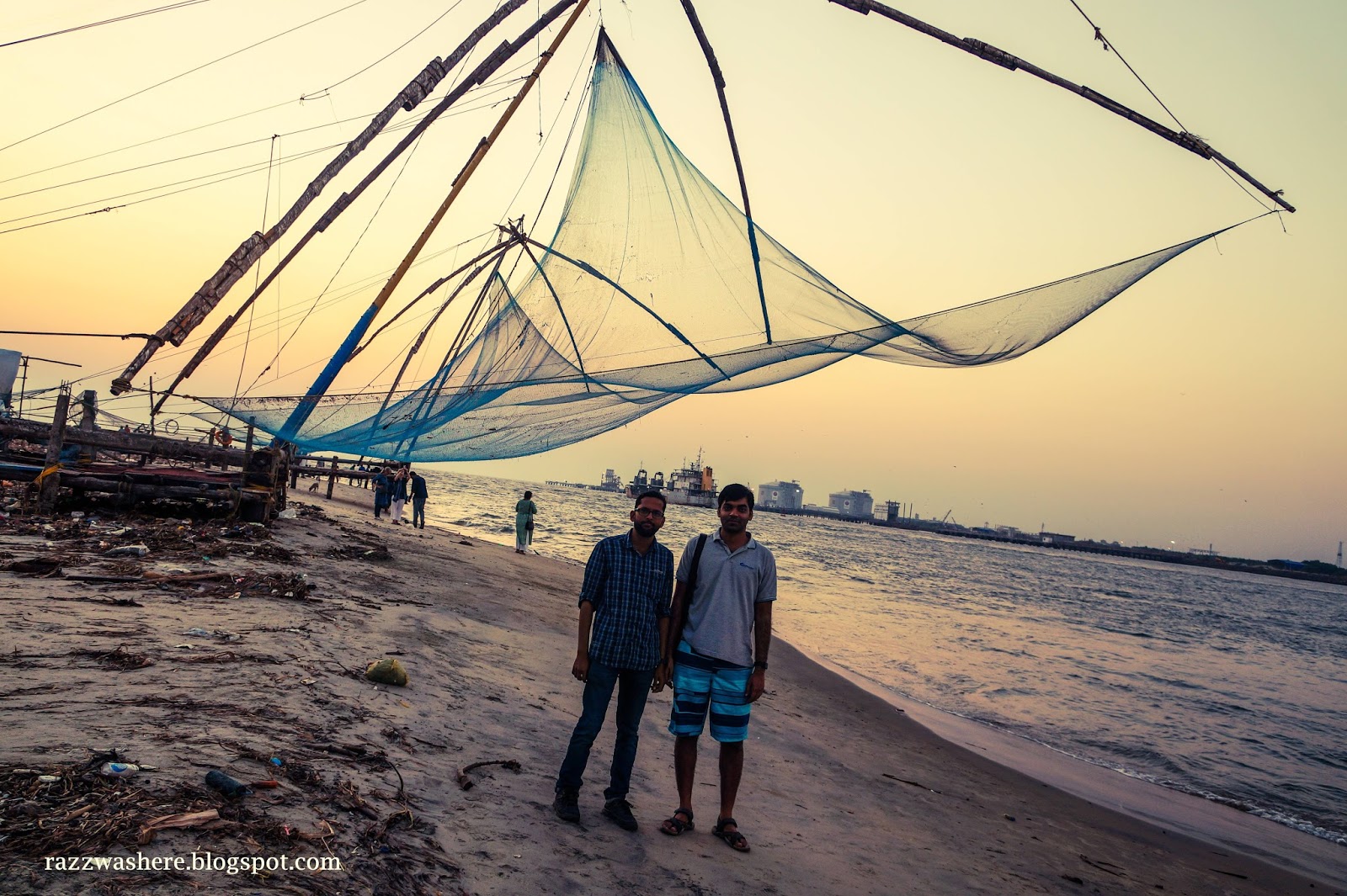 Near Fort Kochi Area the first thing we did was to go to the Maritime Musuem. It was mighty interesting with all the guns and missiles on display. I will write a separate post about it soon.Next, we started off on a casual stroll along the Fort Kochi beach. The place was packed with crowds. To our right along the beach was spread a number of shacks and shops selling souvenirs and eatables. To our left was the sea. At some distance we saw the famous Chinese fishing nets. We went there and tried to understand the workings of the net.