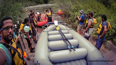 After some time we could see the change in the state of the water. It became more turbulent and we were getting excited now. Soon enough our guide instructed us to strengthen our grip with our feet and start rowing with our hands. In a minute our raft collided with a huge wave. The front of the raft went up a huge angle, stayed there for a split second and then fell into the retreating water. There was a spray of water on our faces and bodies as we tried to hold ourselves in place. This first encounter was mighty thrilling and bought out shouts of joy and excitement. We ran into many more rapids like these now and then.